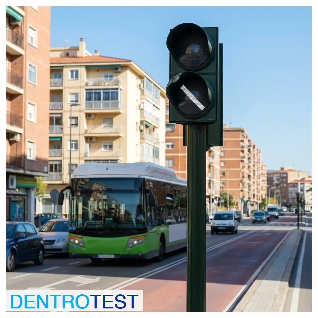 On a traffic light reserved for buses and taxis, what does an illuminated white diagonal stripe pointing to the left indicate?