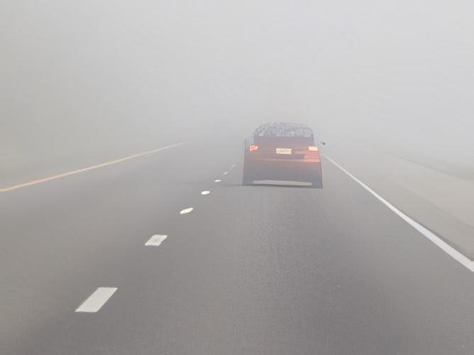 If your motorcycle has a trailer attached, can you ride on the foggy road shown in the photograph?